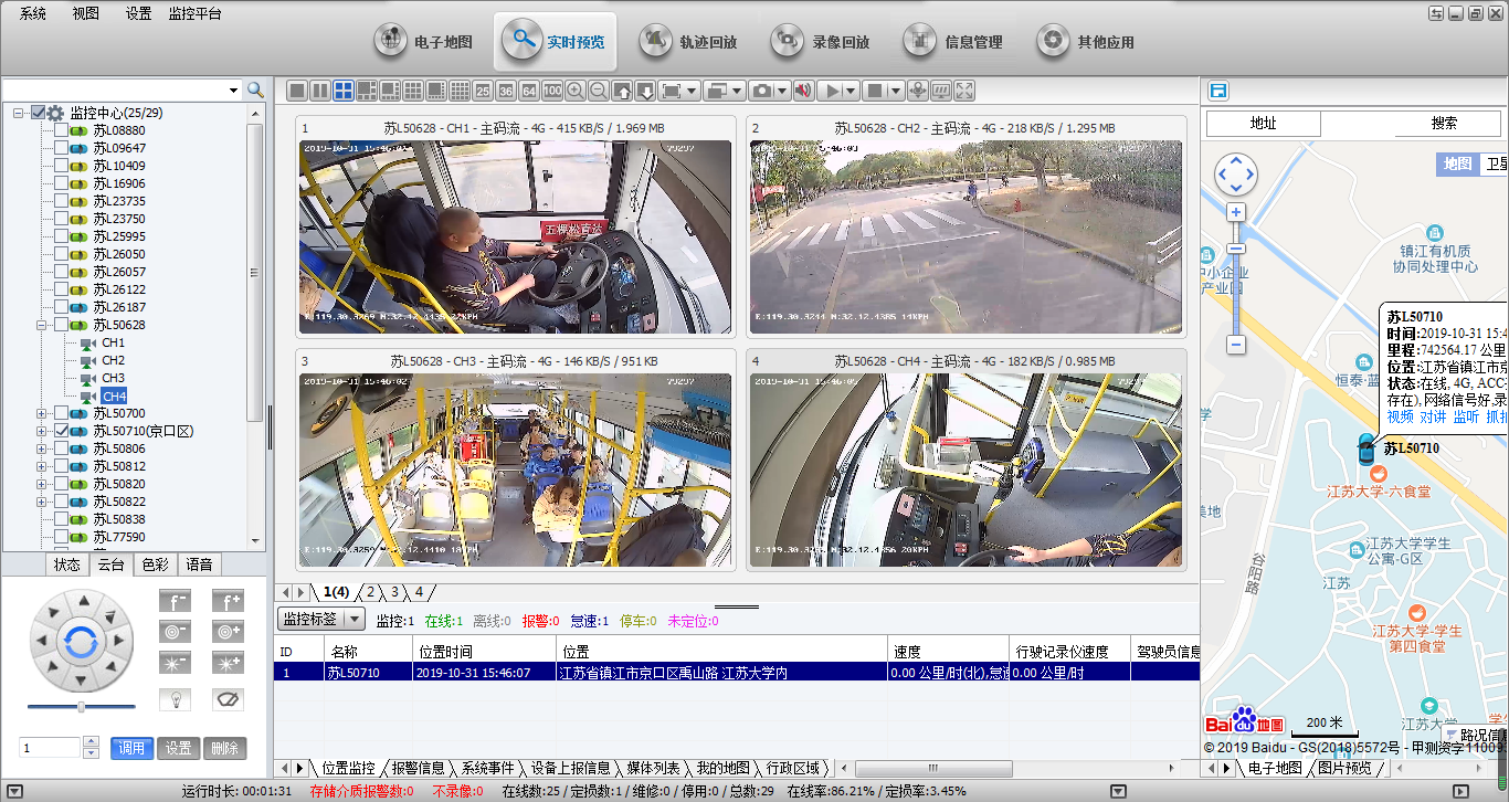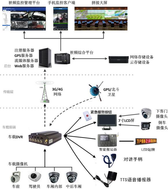 整個系統分為前端車載監控系統、通訊線路、監控平臺兩大部分,前端車載監控系統又包括車載硬盤錄像機、監控攝像機、監聽頭、報站器、報警器、液晶顯示屏、GPS等。